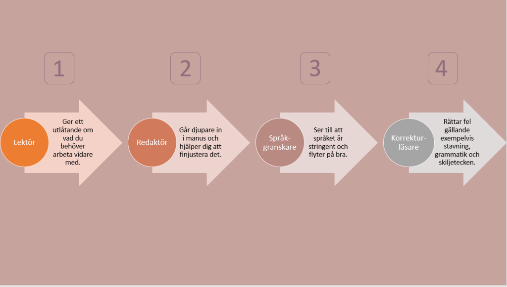 - Korrekturläsaren lägger sista handen på ditt manus. Felstavningar, dubbelt mellanslag och felaktig användning av skiljetecken är exempel på sådant som korrekturläsaren städar bort. Efter korrekturläsning och sista justeringar är manuset redo för publicering.